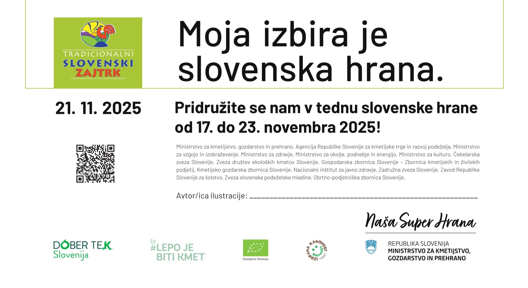Teden slovenske hrane in tradicionalni slovenski zajtrk 21. november 2025 Ob bližajočem tednu slovenske hrane, ki ga bomo obeleževali od 17. do 21. novembra 2025, bomo v petek, 21. novembra, za malico ponudili obrok s sestavinami, ki jih vključujemo v projekt Tradicionalni slovenski zajtrk. Letošnji projekt poteka pod sloganom »Moja izbira je slovenska hrana!«. Tradicionalni slovenski zajtrk je sestavljen iz kruha, masla, medu, mleka in jabolka ali drugega svežega ali suhega sadja brez dodanega sladkorja. Kako poteka teden slovenske hrane in kakšne aktivnosti ga spremljajo, si preberite tukaj. V okviru projekta bomo v tem tednu del dejavnosti tudi na naši šoli namenili ozaveščanju o prednostih lokalne oziroma slovenske hrane, razmisleku o naših prehranjevalnih navadah in o zmanjševanju odpadne hrane. Veseli pa bomo tudi vašega doprinosa k ozaveščanju o zdravem prehranjevanju, razmisleku o prehranjevalnih navadah, zmanjšanju odpadne hrane in spodbujanju lokalne slovenske hrane. Nekaj motivov za sodelovanje pri izvedbi Tradicionalnega slovenskega zajtrka za naše najmlajše je na voljo tukaj: